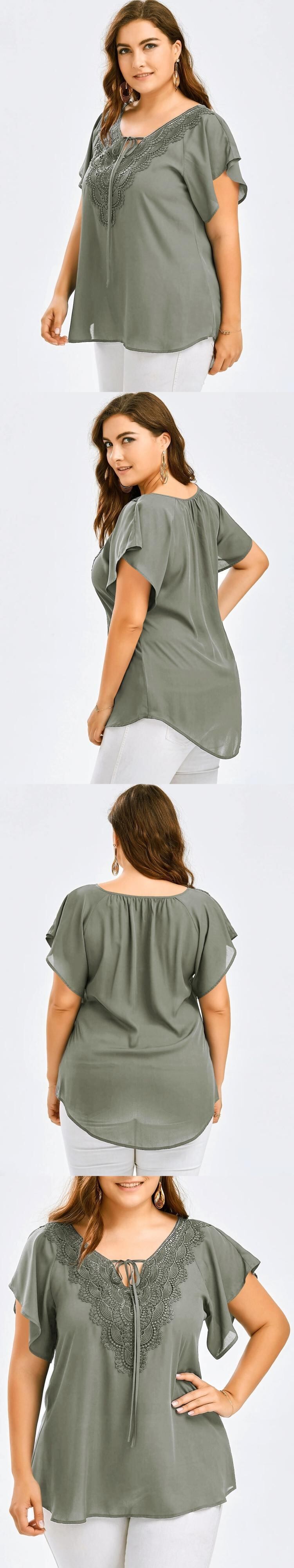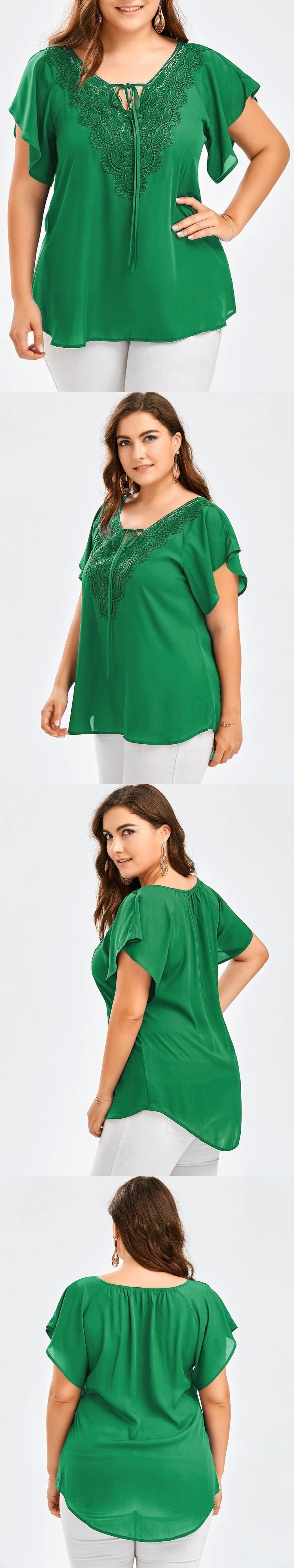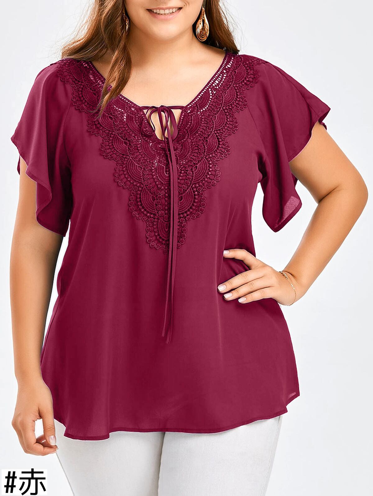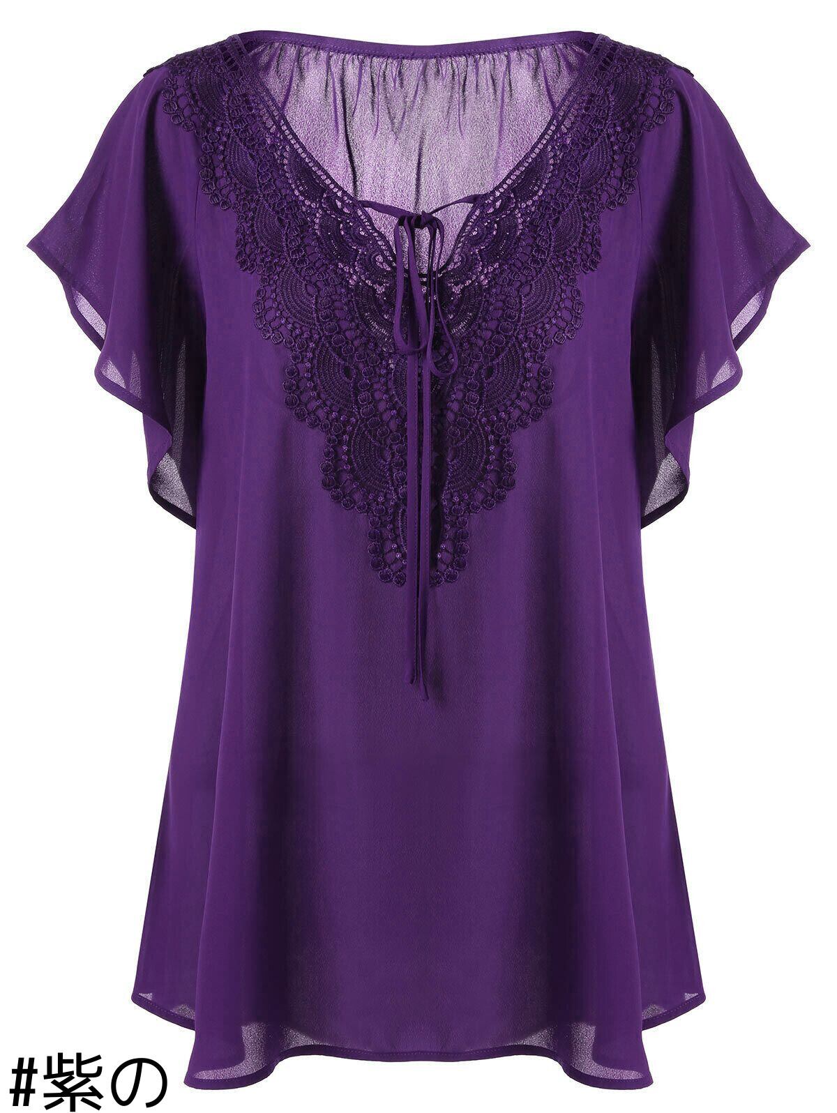 女性のトランペットスリーブ半袖Tシャツレースステッチトップ大型女性のトレンドを販売するヨーロッパとアメリカンスタイルのファッション 大きめサイズ ヨーロピアン 6733093668278603