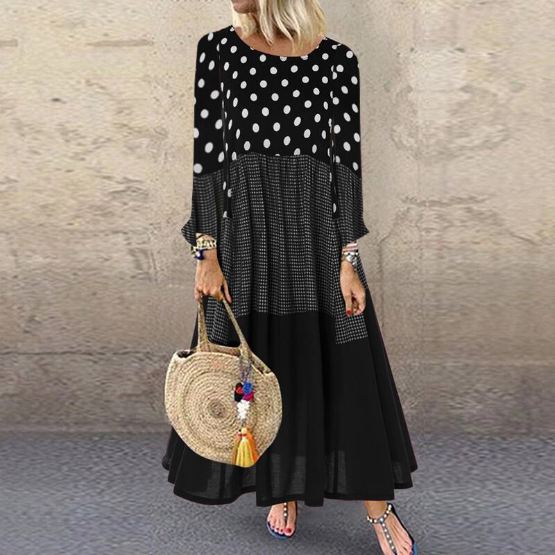 AliExpressアマゾンヨーロッパとアメリカの夏の新しいルーズと拡大プラスファット水玉ステッチ長袖ラウンドネックドレス ロング サマー 夏物 Oネック ヨーロピアン 6733088103030542