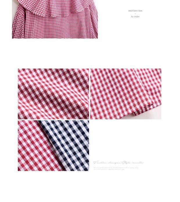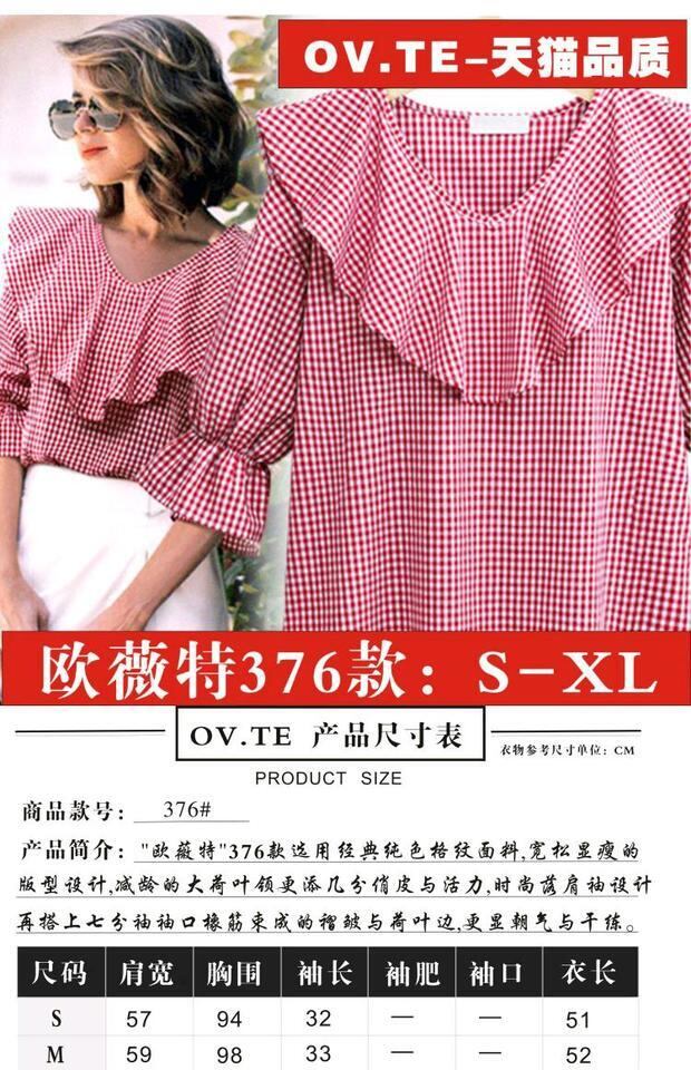 ヨーロッパとアメリカの新しい無地の格子縞の蓮の葉の襟のシャツを販売する夏のファッション七分袖トップトレンディな女性 サマー 夏物 ソリッドカラー ヨーロピアン 6733070139219147