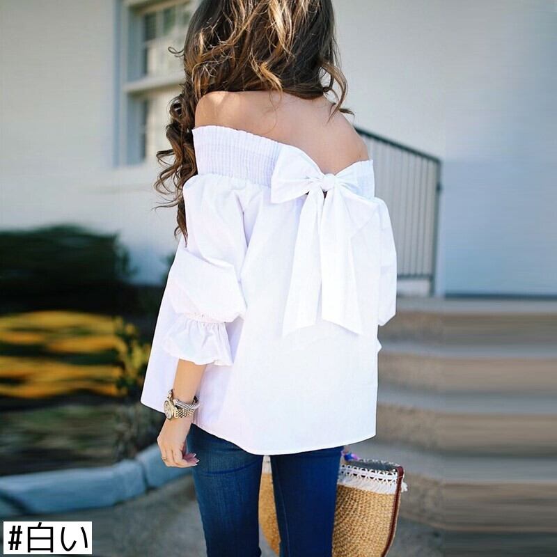 春と夏のヨーロッパとアメリカのファッション、フロントとバック、蝶ネクタイの2つの着用方法、蓮の葉の袖口、一言襟のシャツスタイルのトップス リボン スプリング 春物 サマー 夏物 ヨーロピアン 6733067704669273