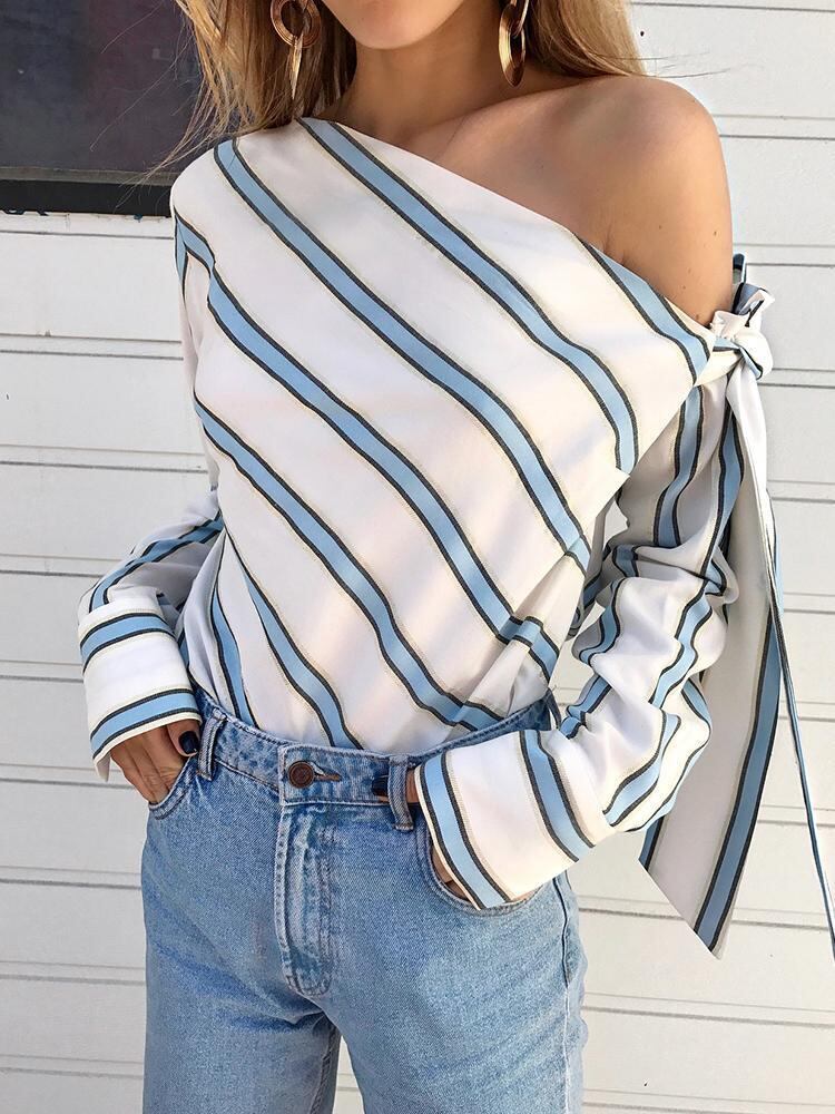 秋と冬の新しいヨーロッパとアメリカのAliExpressシンプルでファッショナブルな斜めの肩のレースアップストライプシャツ女性の潮の良い品質 オータム 秋物 ウィンター 冬物 ヨーロピアン 6733022186064765