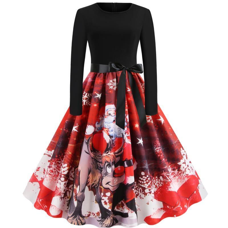 ヨーロッパとアメリカのスタイルのアマゾンセールクリスマスポジショニングフォールドプリントステッチ長袖スイングドレス女性の潮 ロング ヨーロピアン 6733055159313470