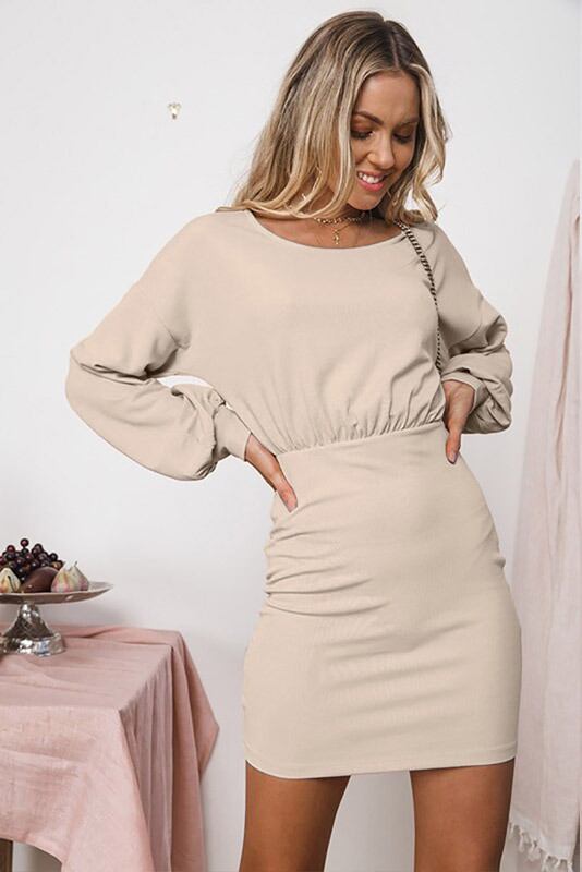 ヨーロッパとアメリカンスタイルのファッションバックジッパーラウンドネックウエストランタン長袖無地ドレス女性の潮 ロング Oネック ソリッドカラー ヨーロピアン 6733047800648325