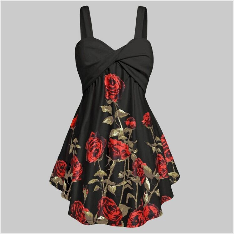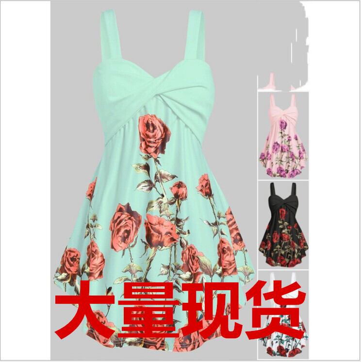ヨーロッパとアメリカのファッションの女性のローズプリントVネッククロスノットハイウエストラージスイングミディアムとロングドレス ハイウェスト ヨーロピアン 6733081865100358