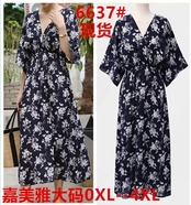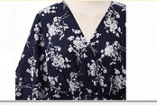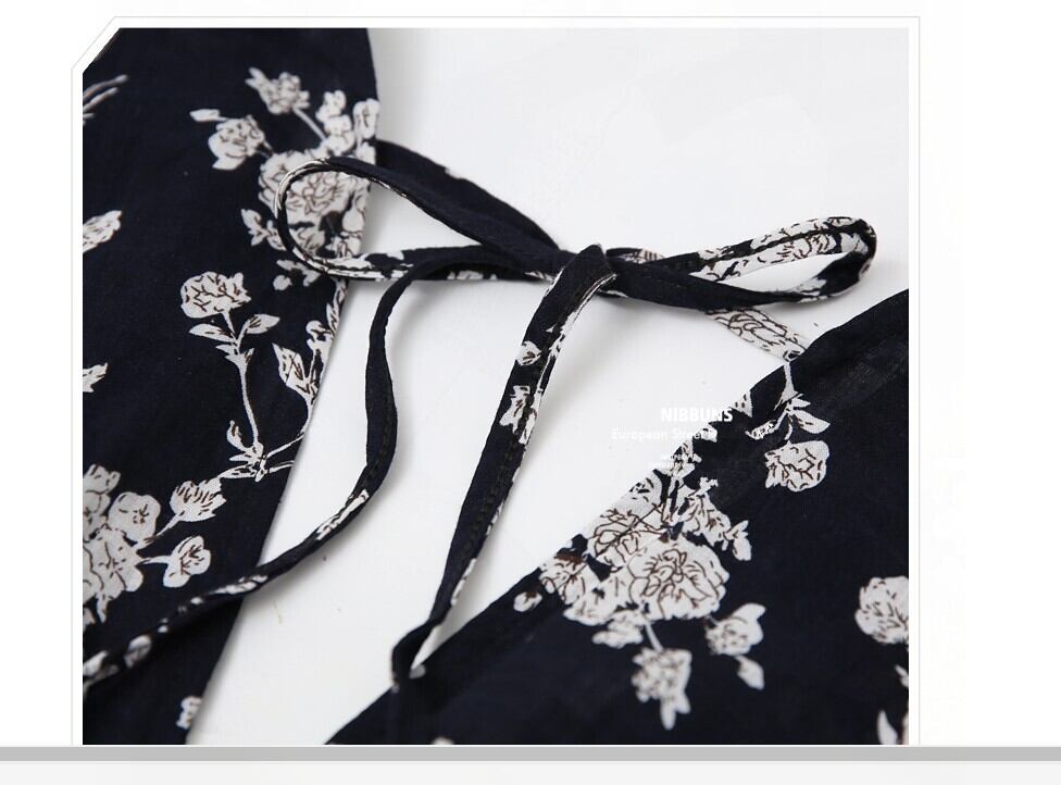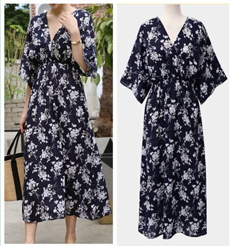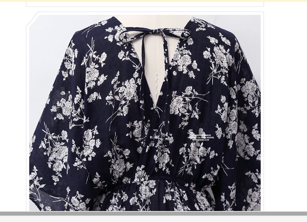 秋の新作ラージサイズレディースVネックバックレスボウ半袖ワンピースコットン&リネンプリント伸縮性ウエストロングスカート リボン エラスティック 大きめサイズ オータム 秋物 6733062341654108