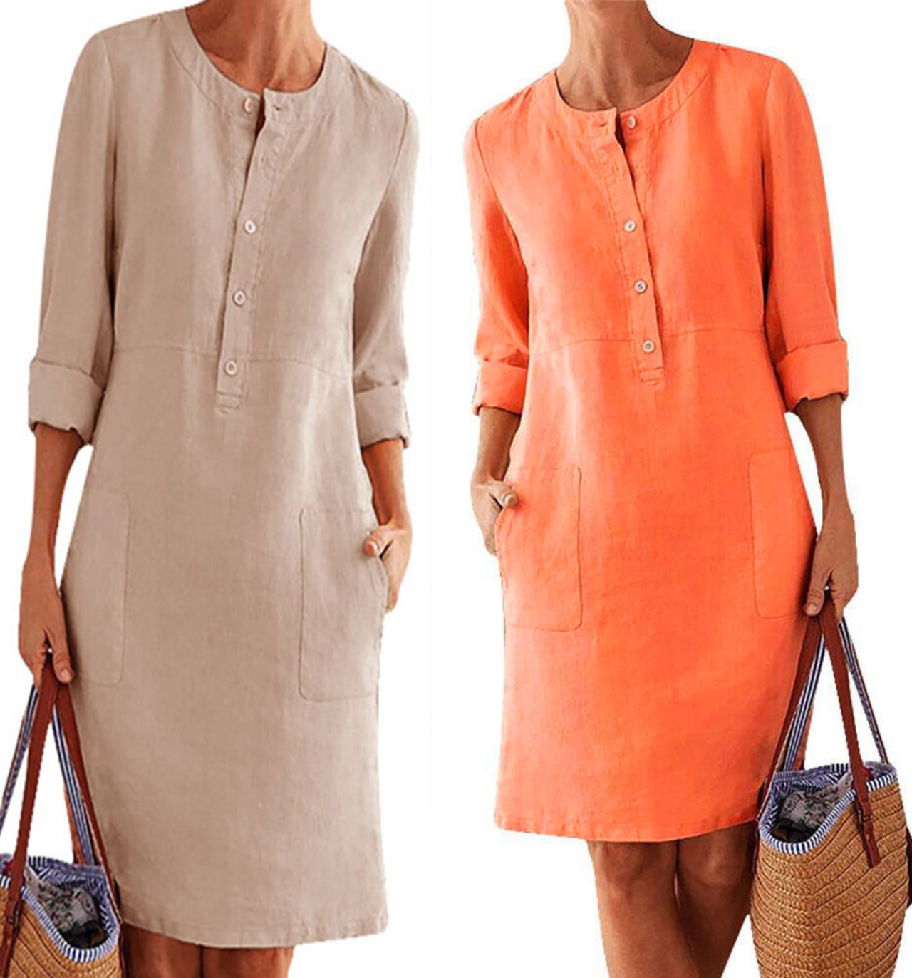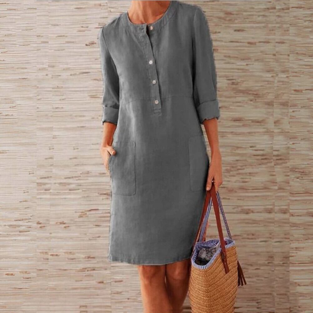 春と夏のミドル丈ファッション新しいAliExpressプラスサイズの女性の綿のラウンドネック汗を吸収する通気性のある長袖のドレス ロング コットン 大きめサイズ スプリング 春物 サマー 夏物 Oネック 6733090133575026