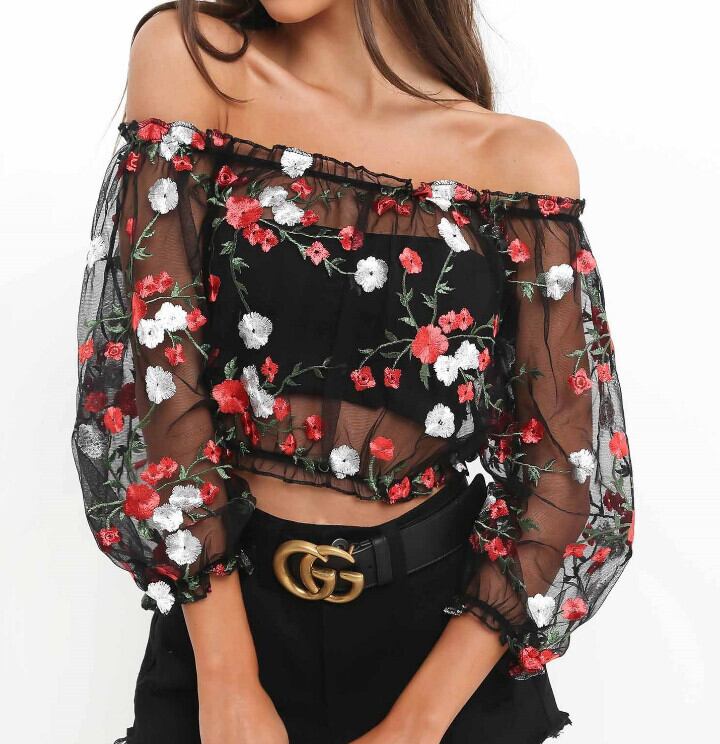 AliExpressのebayヨーロッパとアメリカンスタイルのファッションで女性のメッシュ刺繡を売るセクシーなワンショルダートップ 刺繍 ヨーロピアン 673302228283190