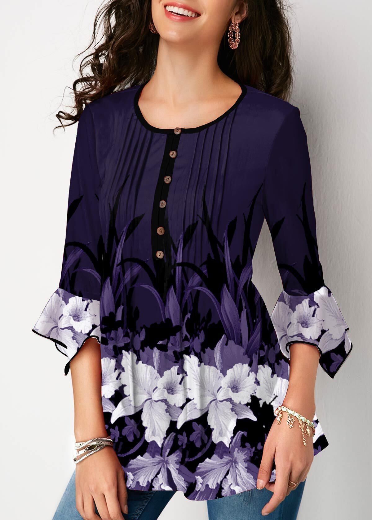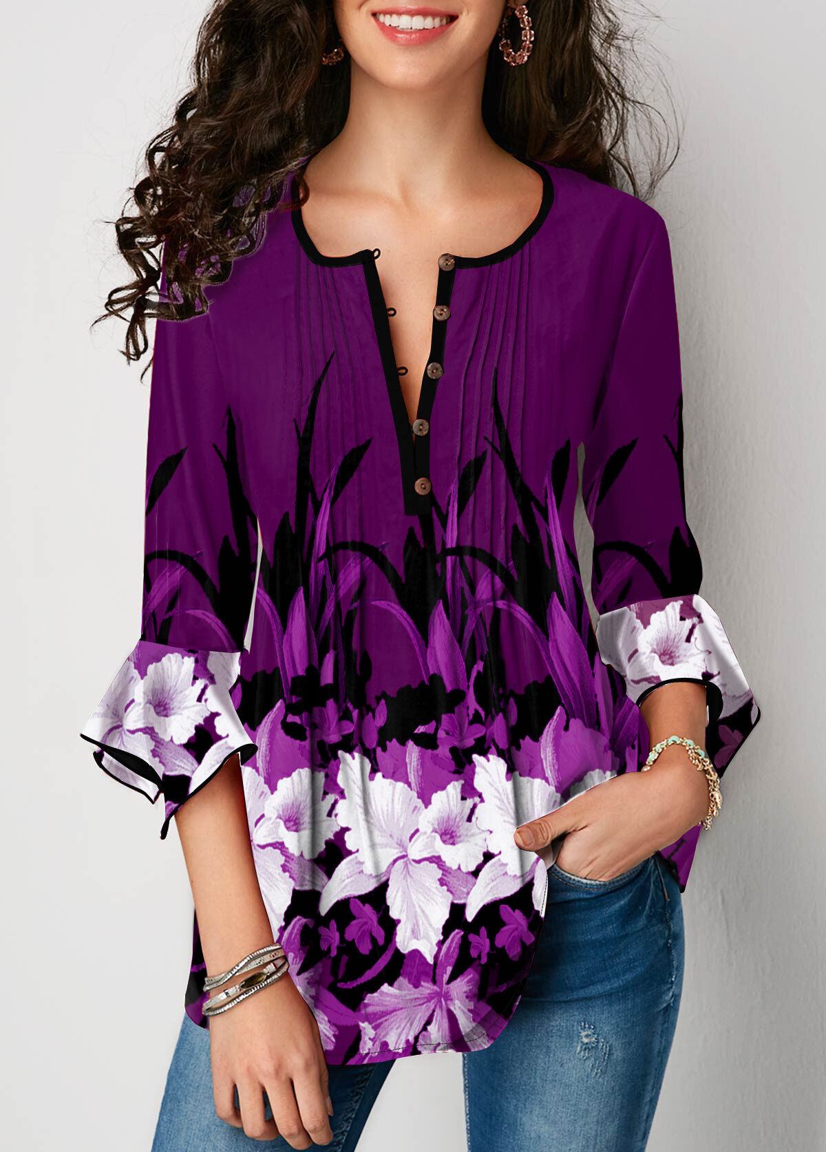 春秋冬暑い気質欧米製品アマゾンロータスリーフスリーブプリントシャツ七分袖VネックTシャツ スプリング 春物 オータム 秋物 ウィンター 冬物 ヨーロピアン 6733083517286857