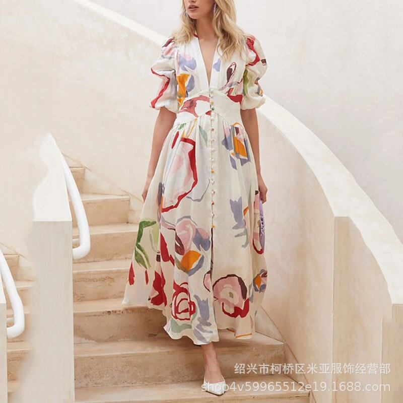 ヨーロッパとアメリカンスタイルのファッションJucaiハイウエストホワイトプリントサスペンダーロングスカート気質通勤ドレス ハイウェスト ヨーロピアン 6733059950242237