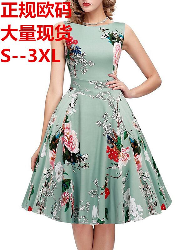 アマゾンヨーロッパとアメリカンスタイルの夏のセール女性レトロヘップバーンスタイルセクシーなノースリーブプリントミドルスカートスイングドレス サマー 夏物 ヨーロピアン 6733073120145582