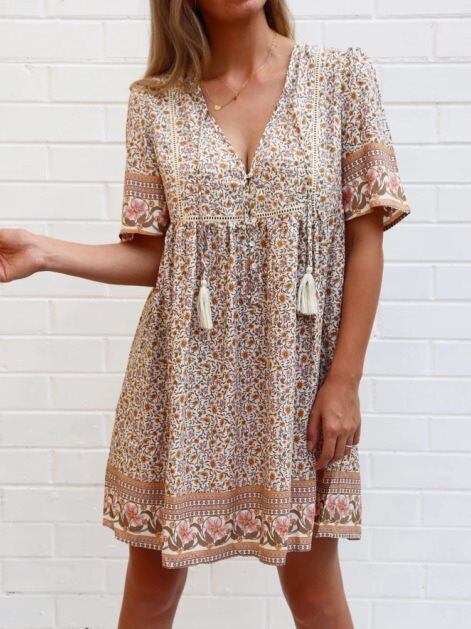 ヨーロッパとアメリカのスタイルの夏のファッションレトロな女性のボヘミアンバケーションスタイルのポジショニングプリントレースアップミドル丈ドレス サマー 夏物 ヨーロピアン 6733069326291522
