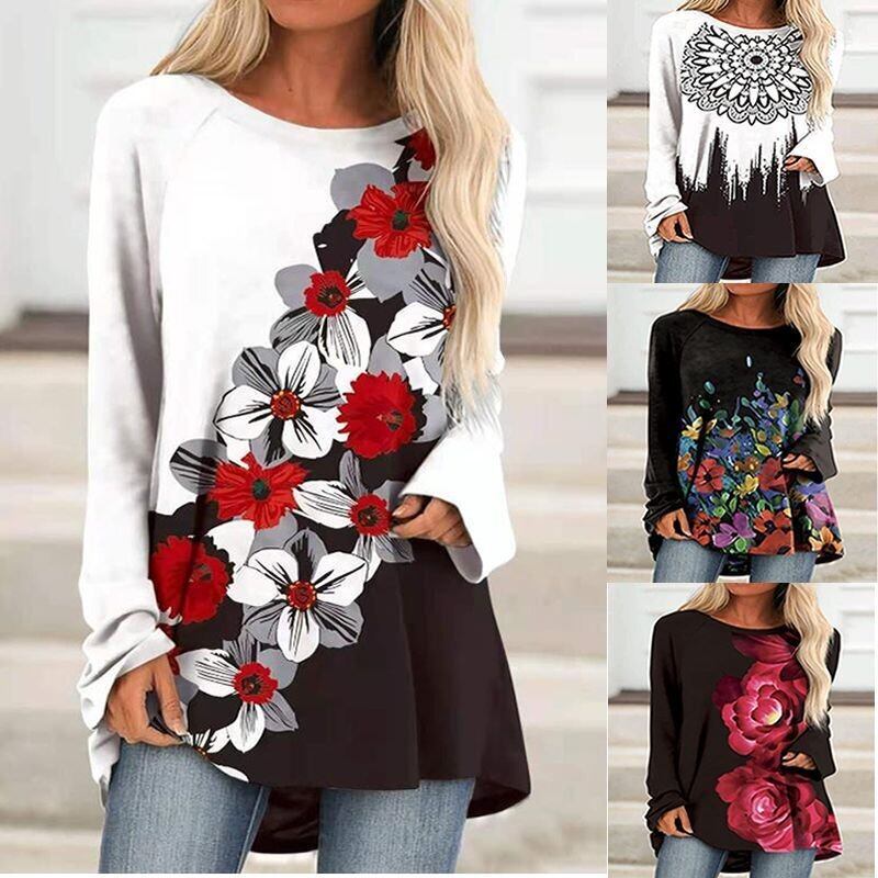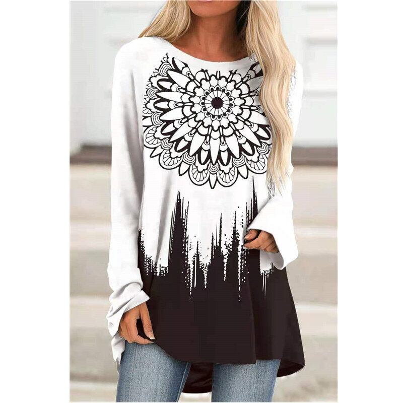秋冬ファッション新作ヨーロッパ・アメリカ長袖ラウンドネックプルオーバーTシャツミドル丈ルーズプリントカジュアルボトミングシャツ ロング オータム 秋物 ウィンター 冬物 Oネック ヨーロピアン 6733010263426085