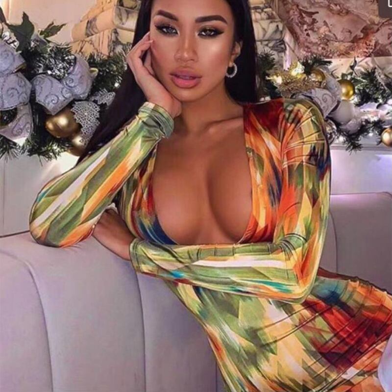 春のアマゾン国境を越えた気質ヨーロピアンビューティープリントスリムフィットセクシーな長袖ドレストレンド ロング スプリング 春物 673308505910379