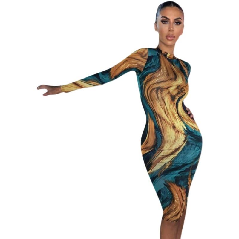 春のアマゾン国境を越えた気質プリントスリムでセクシーな長袖ドレストレンド ロング スプリング 春物 6733032709474794