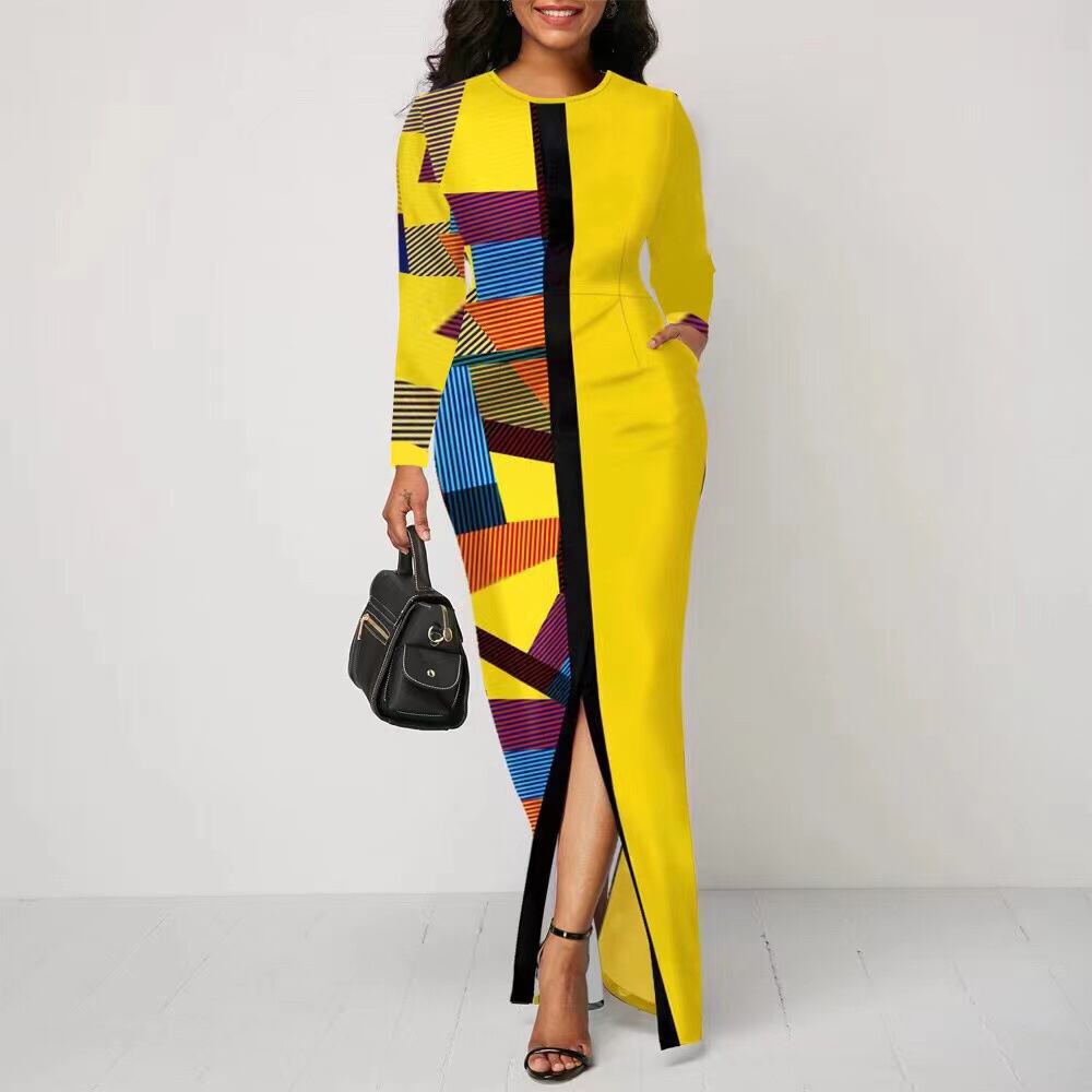 春のファッション新しいAliExpressヨーロッパとアメリカの婦人服長袖ロングスカートスリムステッチプリントスリットドレストレンディ スプリング 春物 ヨーロピアン 6733085237558811