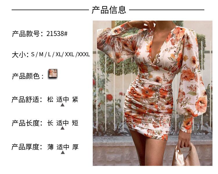 2022年春夏新作ファッションヨーロピアンアメリカンスタイル気質プリントディープvランタンスリーブプリーツ通勤Aラインドレス スプリング 春物 サマー 夏物 6733032711604760