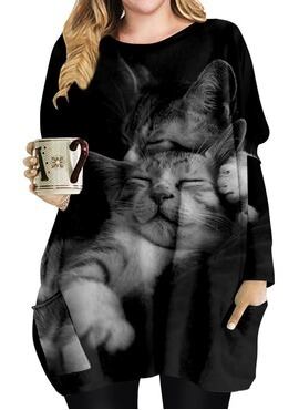 AliExpressebayウィッシュ春と夏の大きいサイズの女性のラウンドネックミドル丈長袖猫プリントプルオーバー ロング 大きめサイズ スプリング 春物 サマー 夏物 Oネック 6733021842255310
