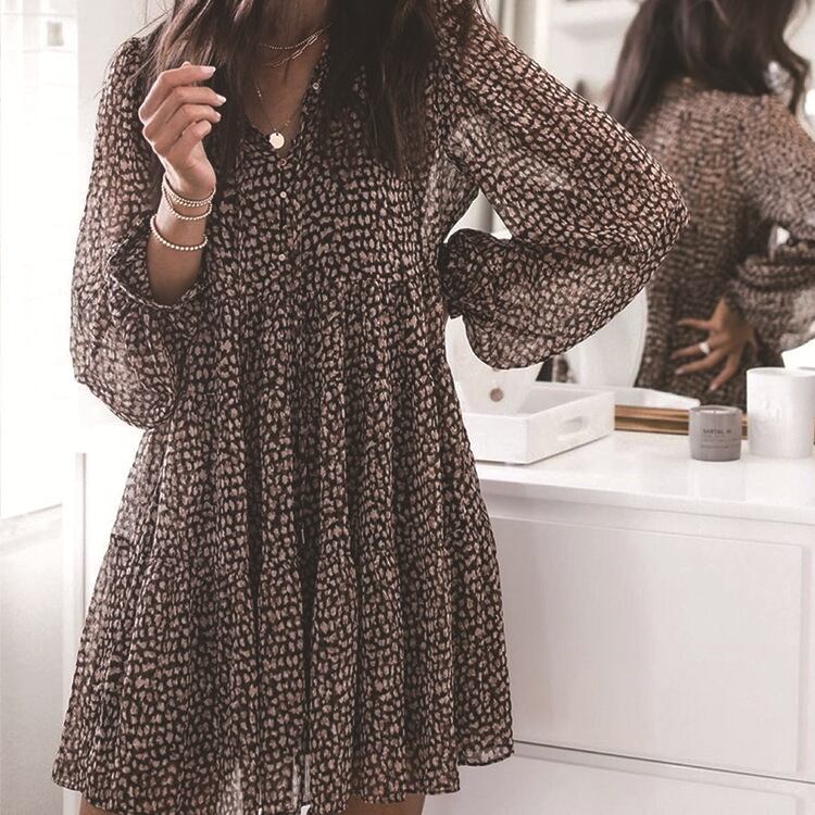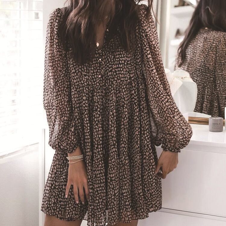 ヨーロッパとアメリカンスタイルの春と夏の新しい気質Vネックヒョウ柄Aラインプリーツルーズバブル長袖ドレスDRES ロング スプリング 春物 サマー 夏物 ヨーロピアン 6733096812068307