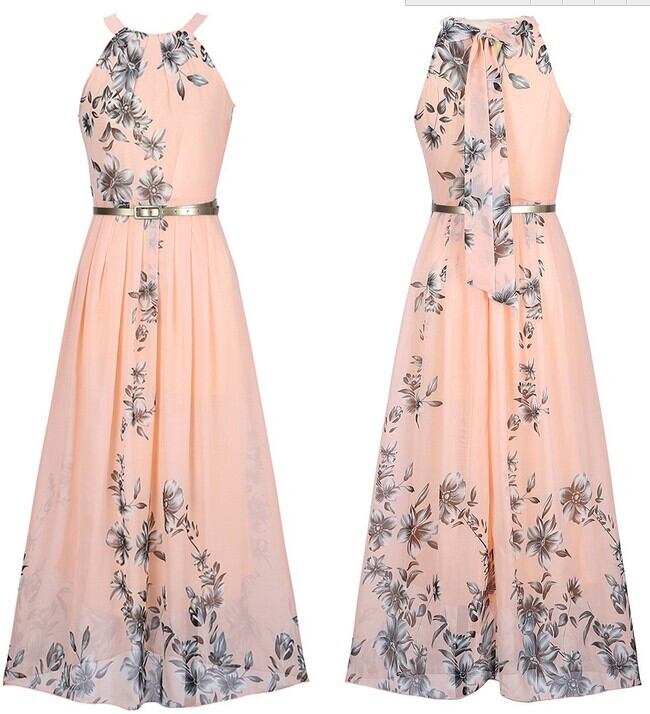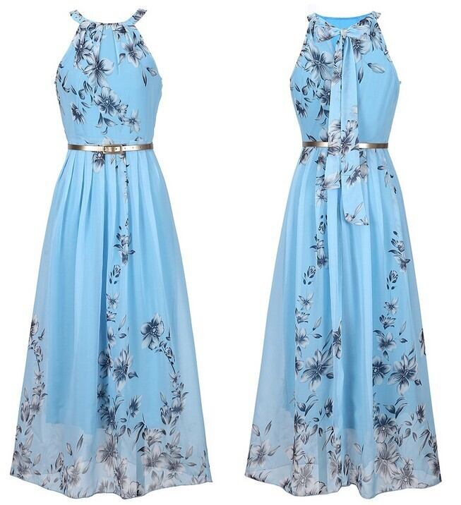 夏AliExpressボヘミアンプリントシフォンビーチAラインロングスカートノースリーブラウンドネックホルタードレス サマー 夏物 Oネック 6733042676148957