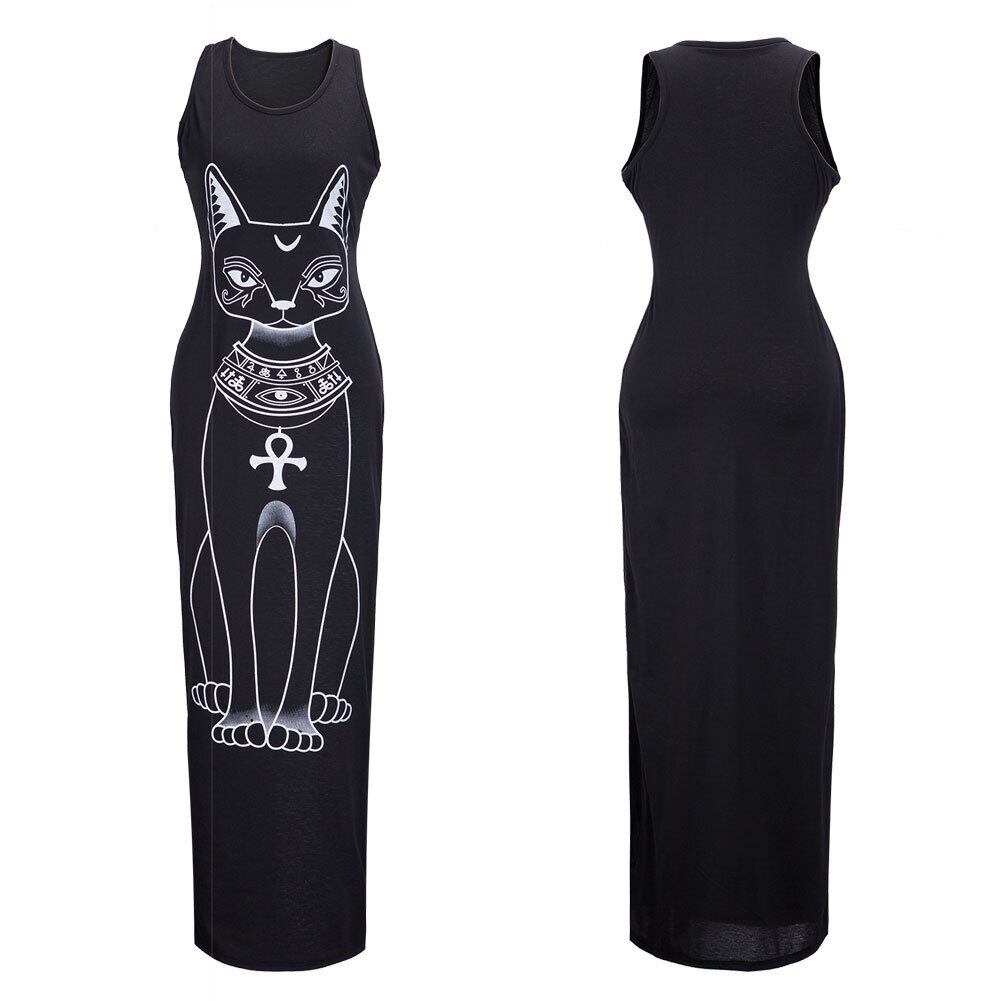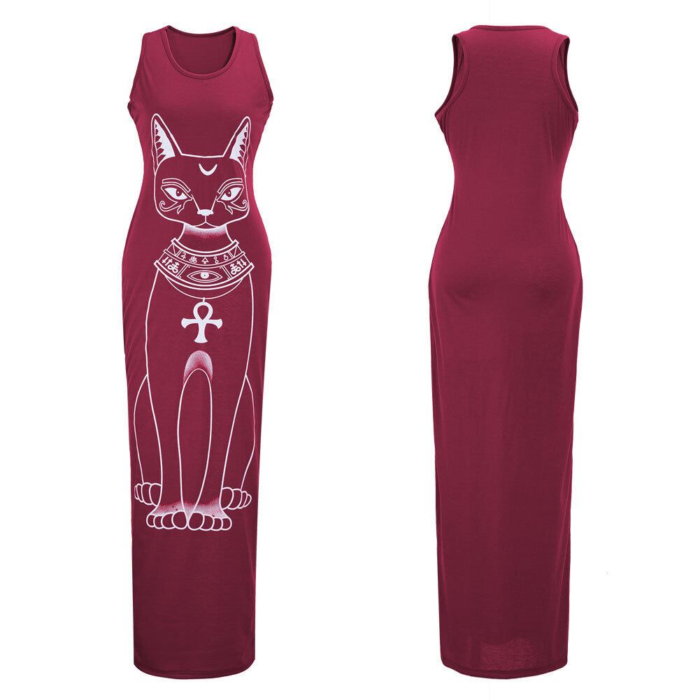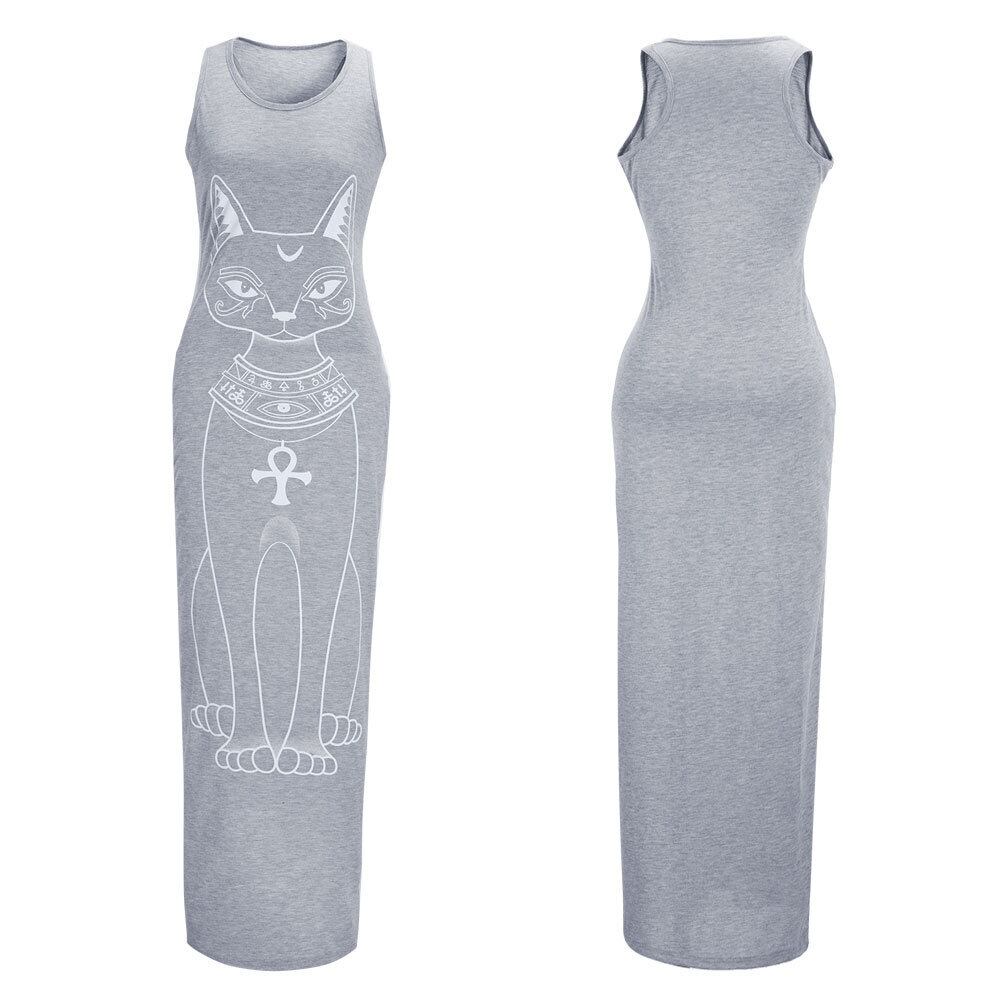 EbayAliExpress夏ヨーロッパとアメリカンスタイルの新しいハイウエスト子猫ラウンドネックプリントノースリーブグレーロングドレス女性 サマー 夏物 Oネック ヨーロピアン 6733017514884537