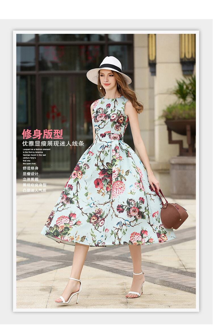 サマーファッションセールヨーロピアンステーションオールマッチエレガントな新作スリムスリムプリントワンピースミドル丈ラージスイングスカート 夏物 6733075717410022