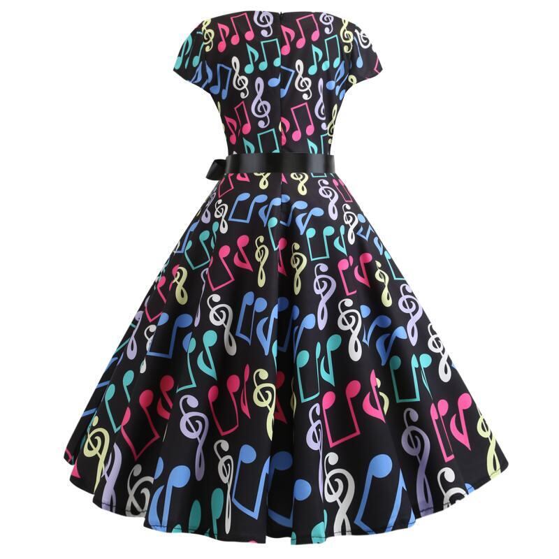 夏の新しいアマゾン爆発スタイルレトロヘップバーンスタイルの音符はベルトを送るために大きなスイングドレスを印刷します サマー 夏物 ハーネス 6733053433646187