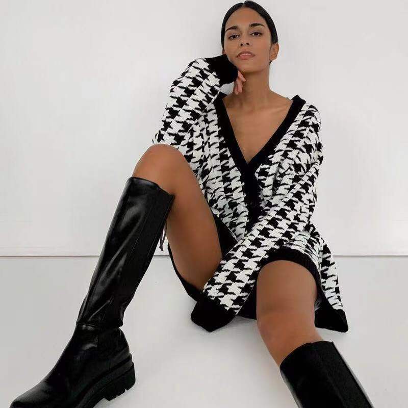 秋冬ヨーロッパとアメリカの新しいスタイルAliExpressセーター女性ルーズVネック千鳥格子長袖ニットカーディガンジャケットコントラストカラー ロング オータム 秋物 ウィンター 冬物 ヨーロピアン 673301915191138