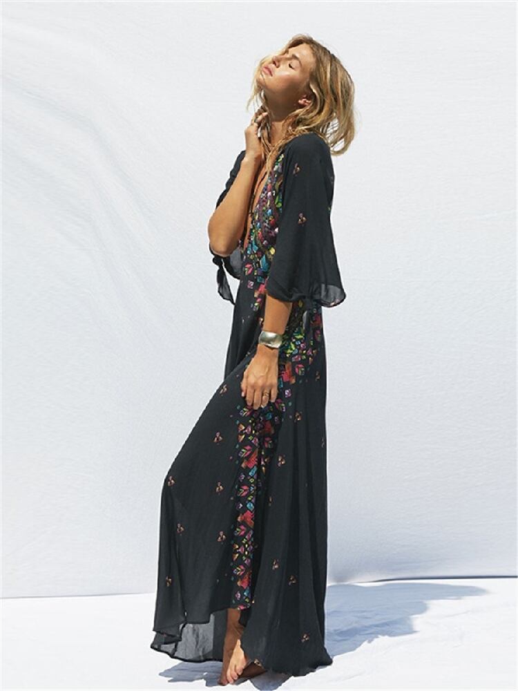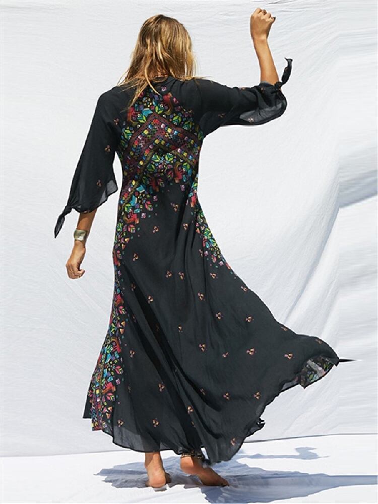 ヨーロッパとアメリカンスタイルのプルオーバーボタン夏の気質ファッションボヘミアンビーチバケーションVネックプリントドレスロングスカート サマー 夏物 ヨーロピアン 6733071757757291