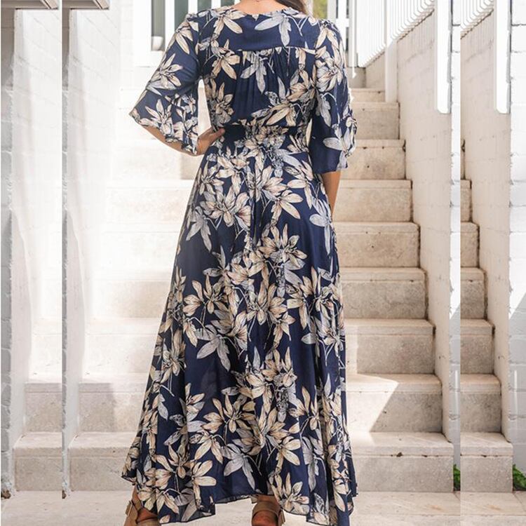 ヨーロピアンステーションサマースカートLサイズVネックラージスウィングドレスハイウエスト気性スリムウエストロングスカート ハイウェスト 大きめサイズ 夏物 6733041007495449