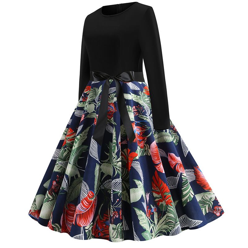 ヨーロッパとアメリカンスタイルの気質新しいプリントステッチ長袖スイングドレストレンディなリボン ロング ヨーロピアン 6733064746423872