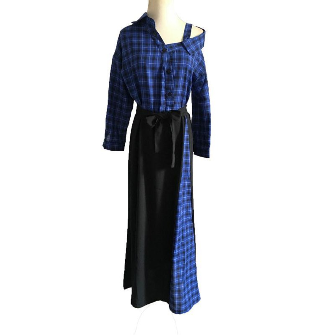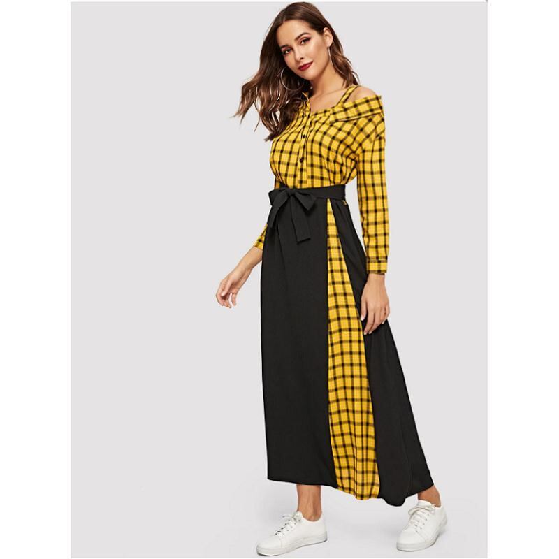 女性のebayチェック柄の不規則なオフショルダードレス+ベルトの女性の潮の良質を販売するヨーロッパとアメリカのスタイルのファッション ハーネス ヨーロピアン 6733020950822842