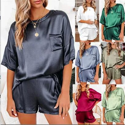 ヨーロピアンとアメリカンスタイルの夏の無地ラウンドネックサテンスカイブルールーズ半袖Tシャツショーツカジュアルツーピーススーツ サマー 夏物 ブルマー Oネック ソリッドカラー 673305395893870