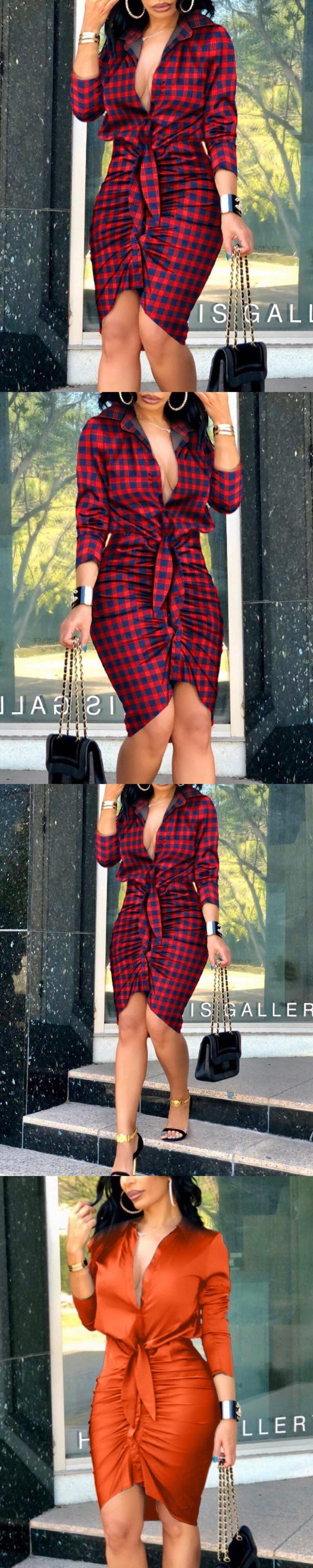 AliExpressヨーロッパとアメリカンスタイルのファッション気質夏Vネックネクタイ無地長袖ミドル丈シャツドレス女性の潮 ロング サマー 夏物 ソリッドカラー ヨーロピアン 6733097117975759