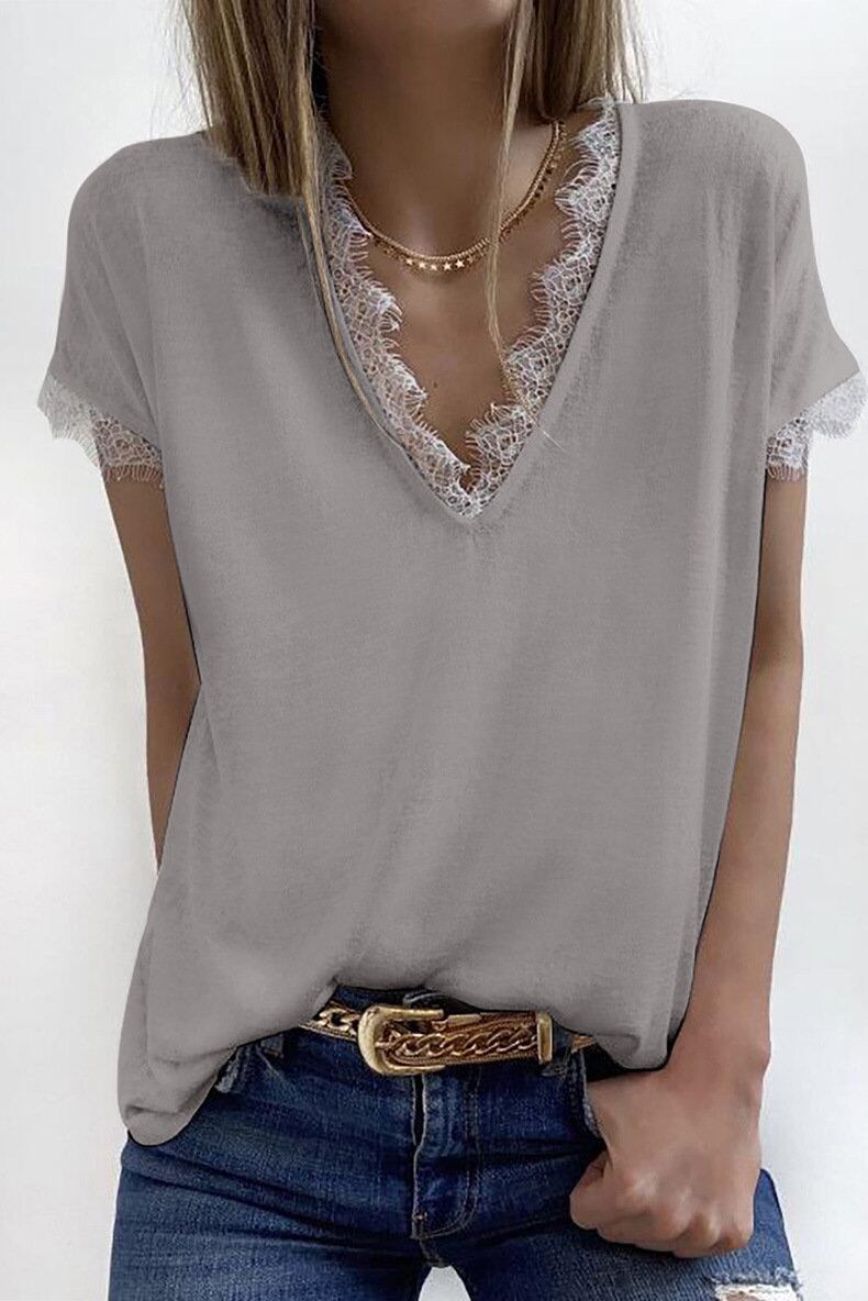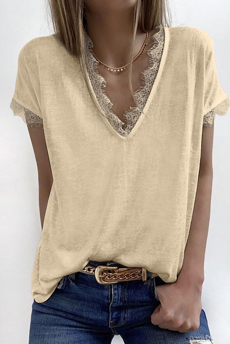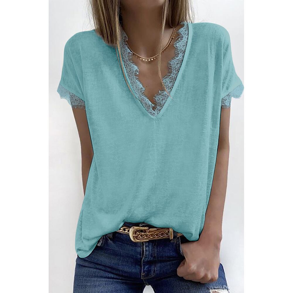 夏のヨーロッパとアメリカンスタイルの新しい無地Tシャツ女性のセクシーなVネックレースステッチカジュアル半袖ボトミングシャツトップ サマー 夏物 ソリッドカラー ヨーロピアン 6733056913322665