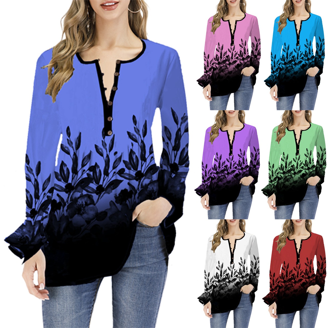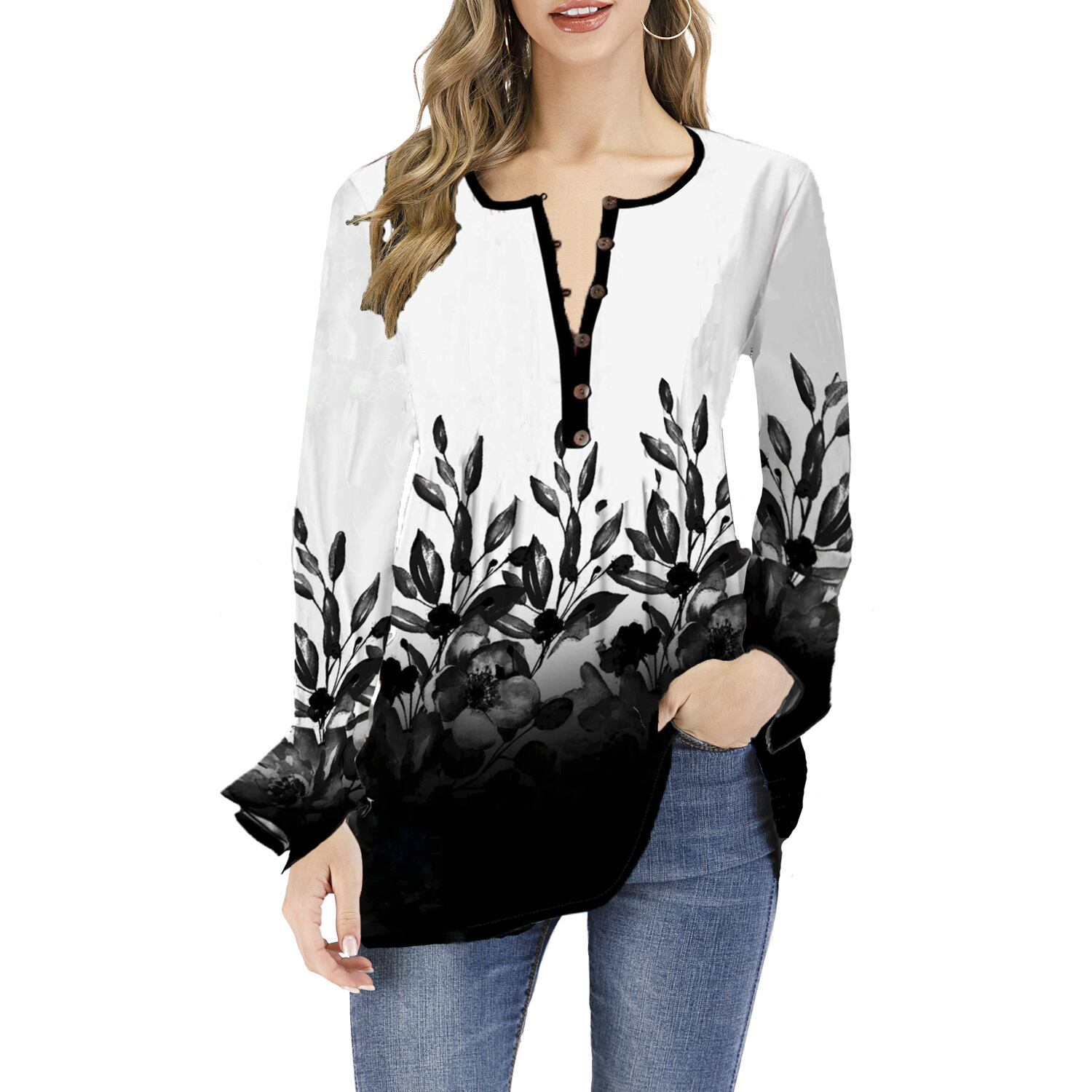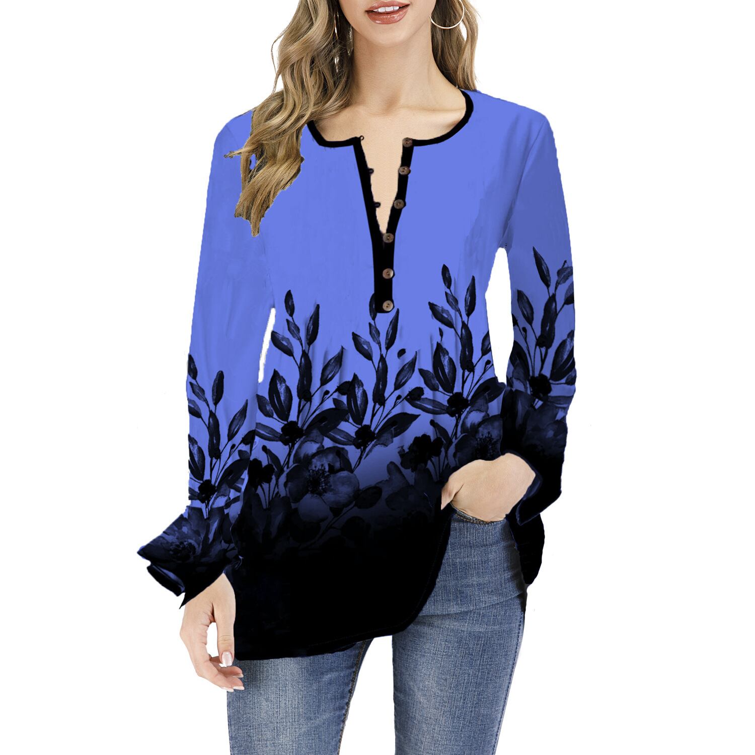 ヨーロッパとアメリカのスタイルの秋と冬の新しいプリントTシャツアマゾンヨーロッパとアメリカのオープンカラーの蓮の葉の袖長袖トップラージサイズのTシャツのトレンド ロング 大きめサイズ オータム 秋物 ウィンター 冬物 ヨーロピアン 6733045046090860