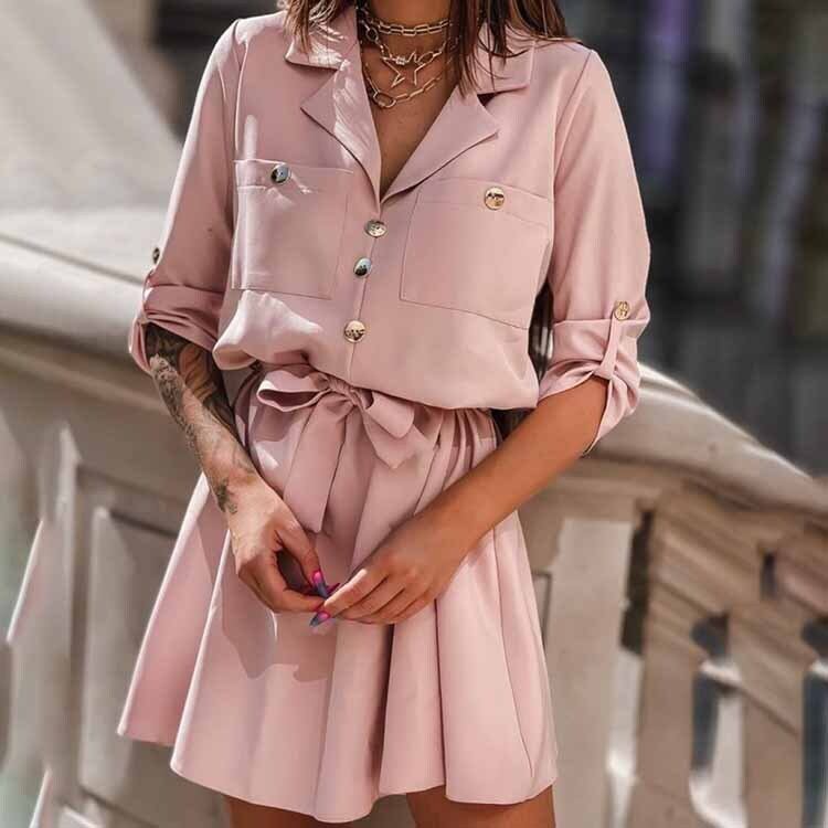 秋冬新作ヨーロピアンサイズスタイル気質レディース無地スーツカラーボタンプリーツフリルワンピーストレンディ オータム 秋物 ウィンター 冬物 ソリッドカラー 6733054979326539
