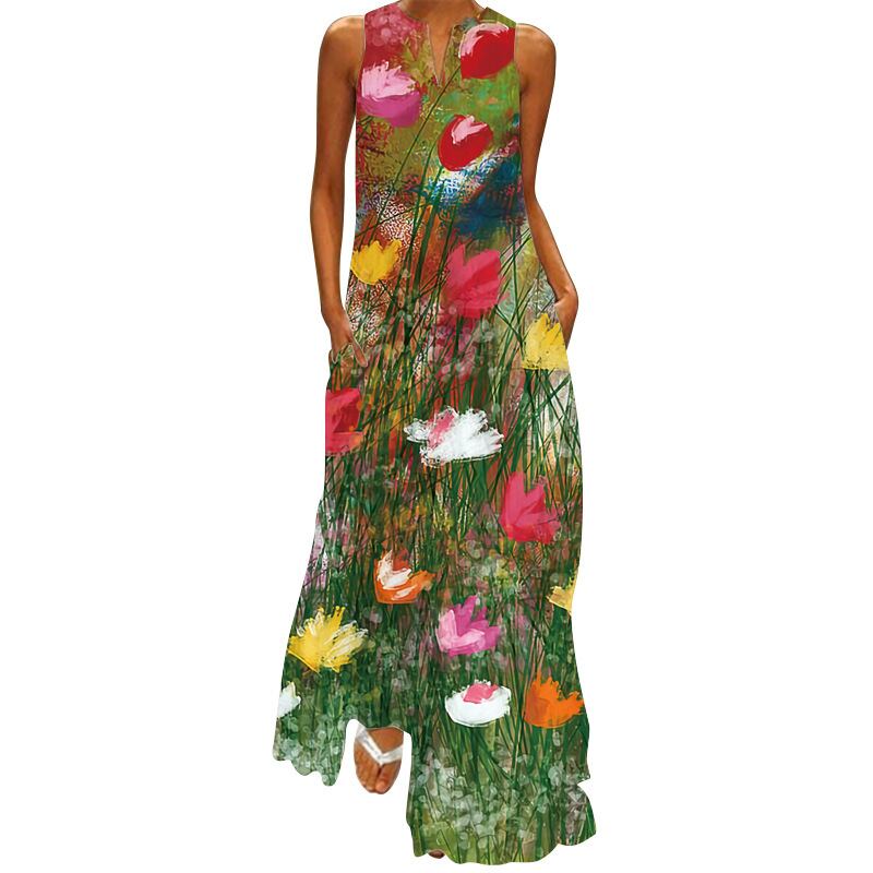 2022年夏独立局ニューヨーロピアンとアメリカンレトロプリントロングドレスVネックマルチカラーロングセクシーノースリーブドレス サマー 夏物 6733077744847477