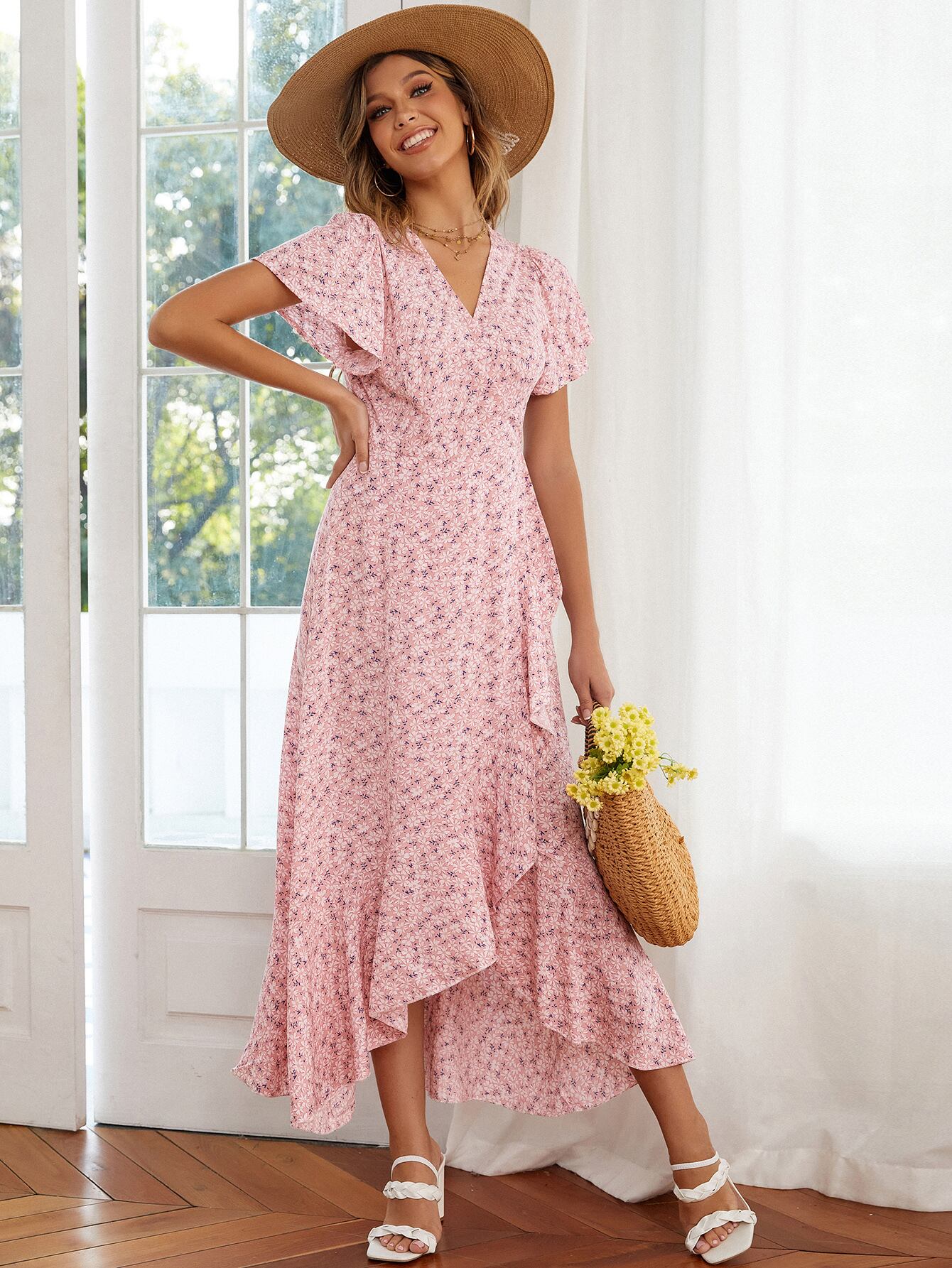 独立局AliExpressヨーロッパとアメリカの綿の花柄フリル不規則なハイウエストストラップVネック大スイングスカート女性の潮 ハイウェスト コットン ラッフル ヨーロピアン 6733059530945821