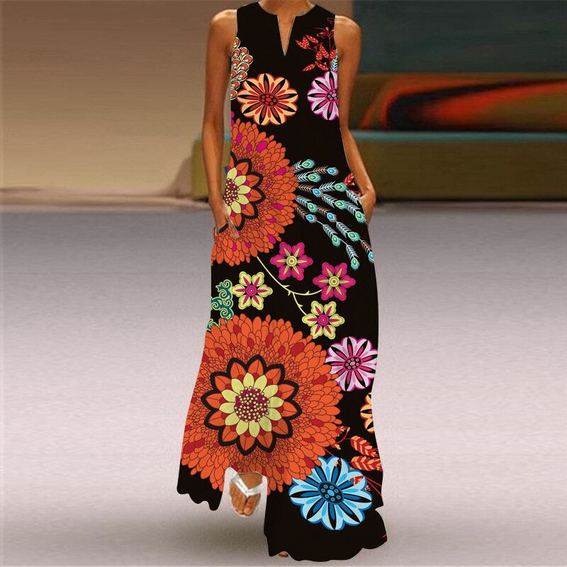 ヨーロッパとアメリカンスタイルのファッション気質新しい夏の女性のノースリーブVネックレトロプリントドレスロングスカートヨーロッパの美容ドレス サマー 夏物 ヨーロピアン 6733067490896731