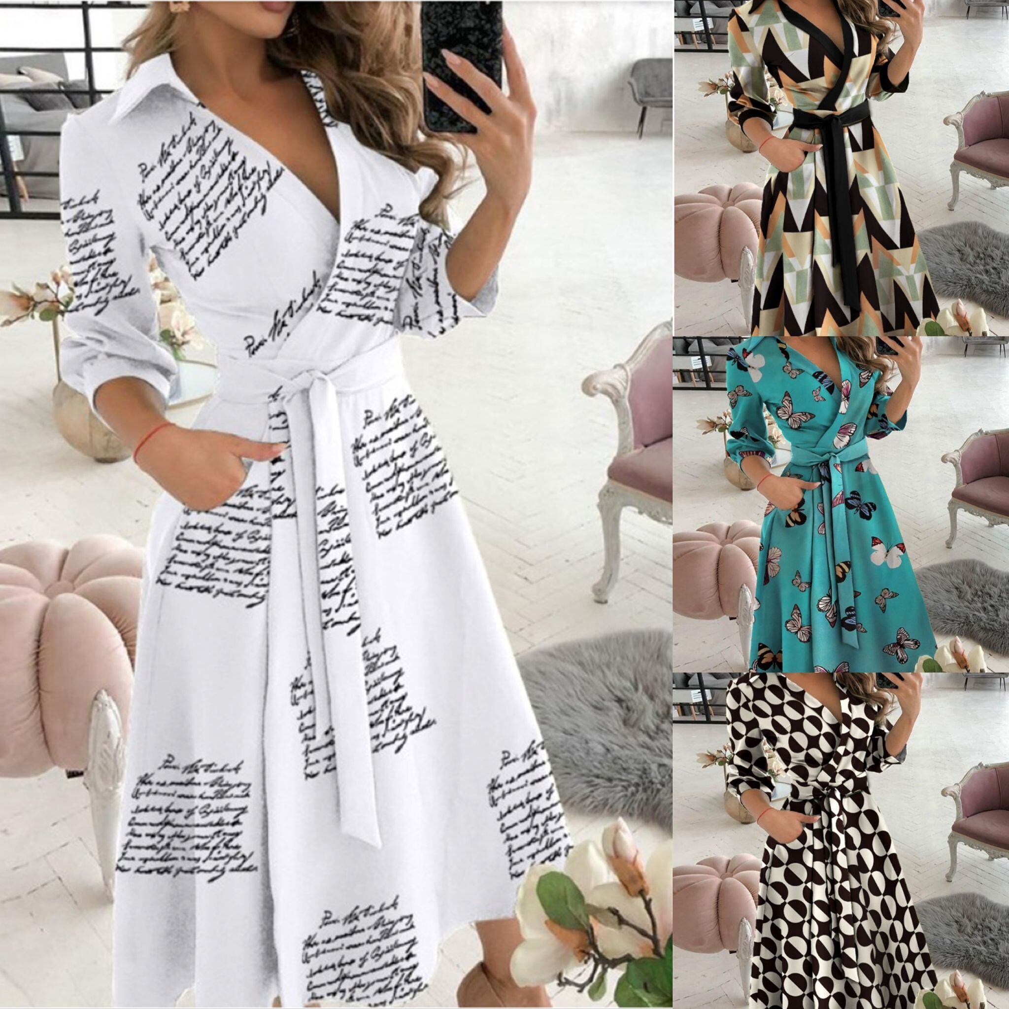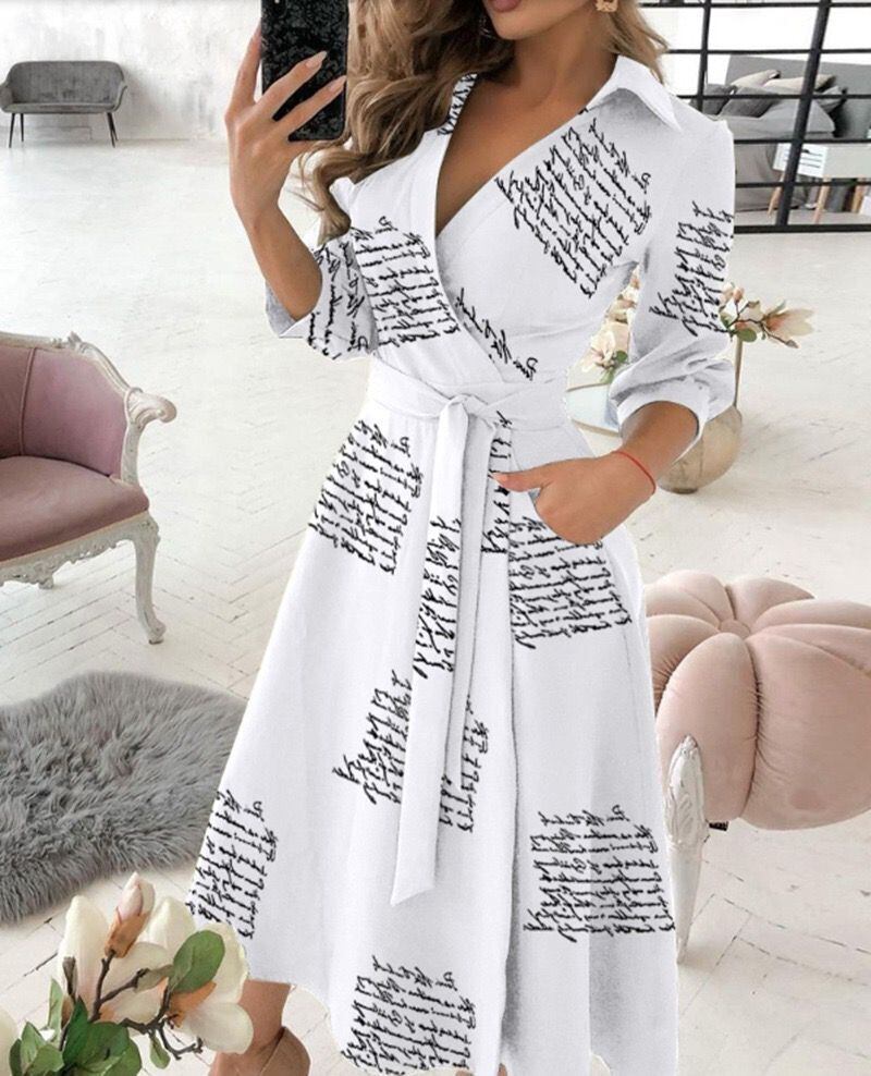 夏のヨーロッパとアメリカの新しい気質のVネックプリントラペルネクタイシャツ長袖ドレス(ベルト付き) ロング サマー 夏物 ハーネス ヨーロピアン 6733015421802906
