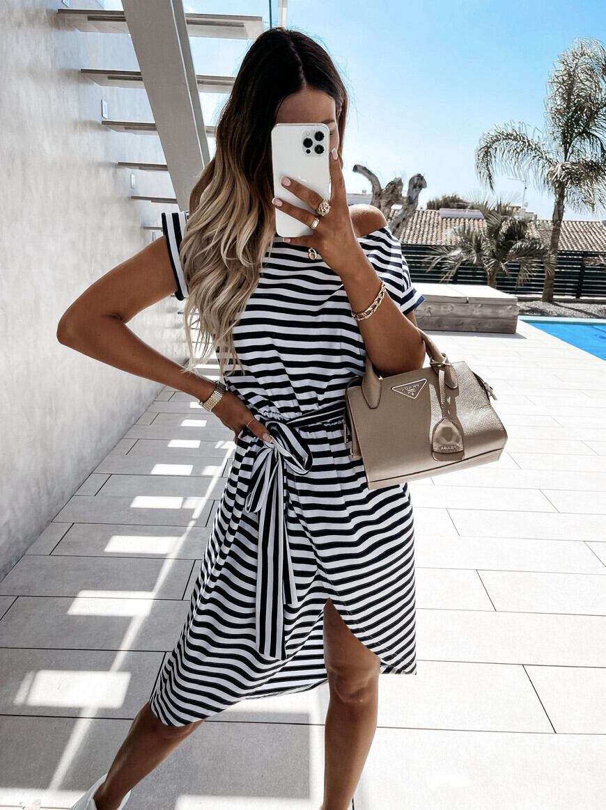 ヨーロピアンスタイルとアメリカンスタイルのストリートストライプルーズウエストネクタイベルト半袖ストライプワンピースイレギュラーカジュアルミドル丈スカート ハーネス 6733021669479033