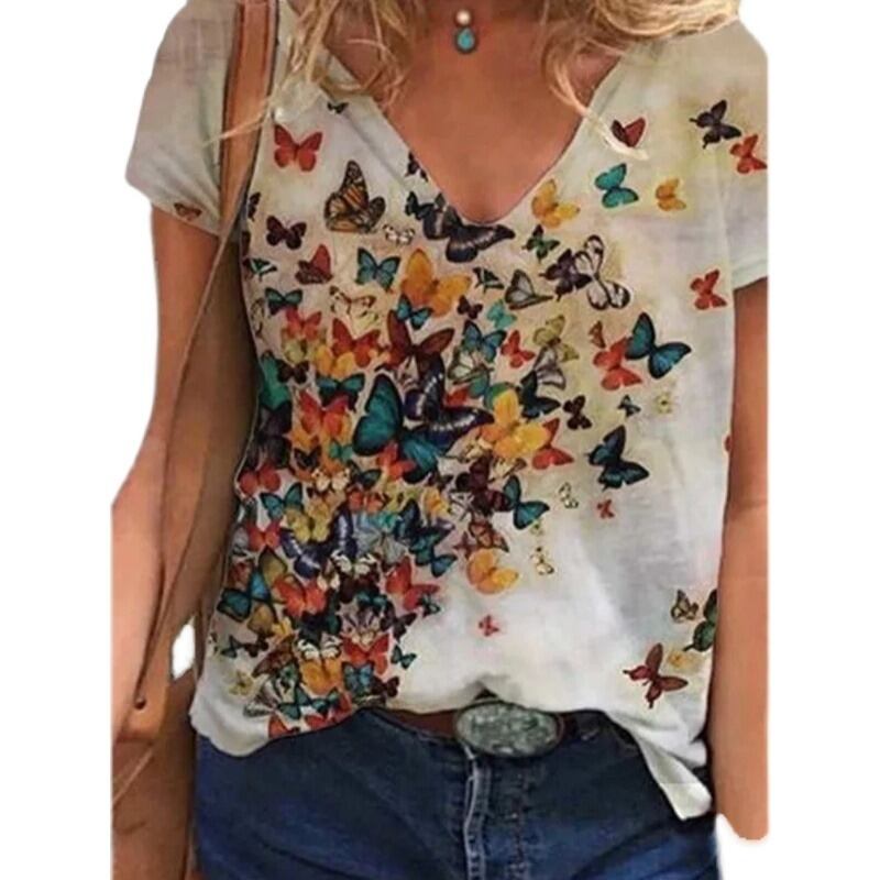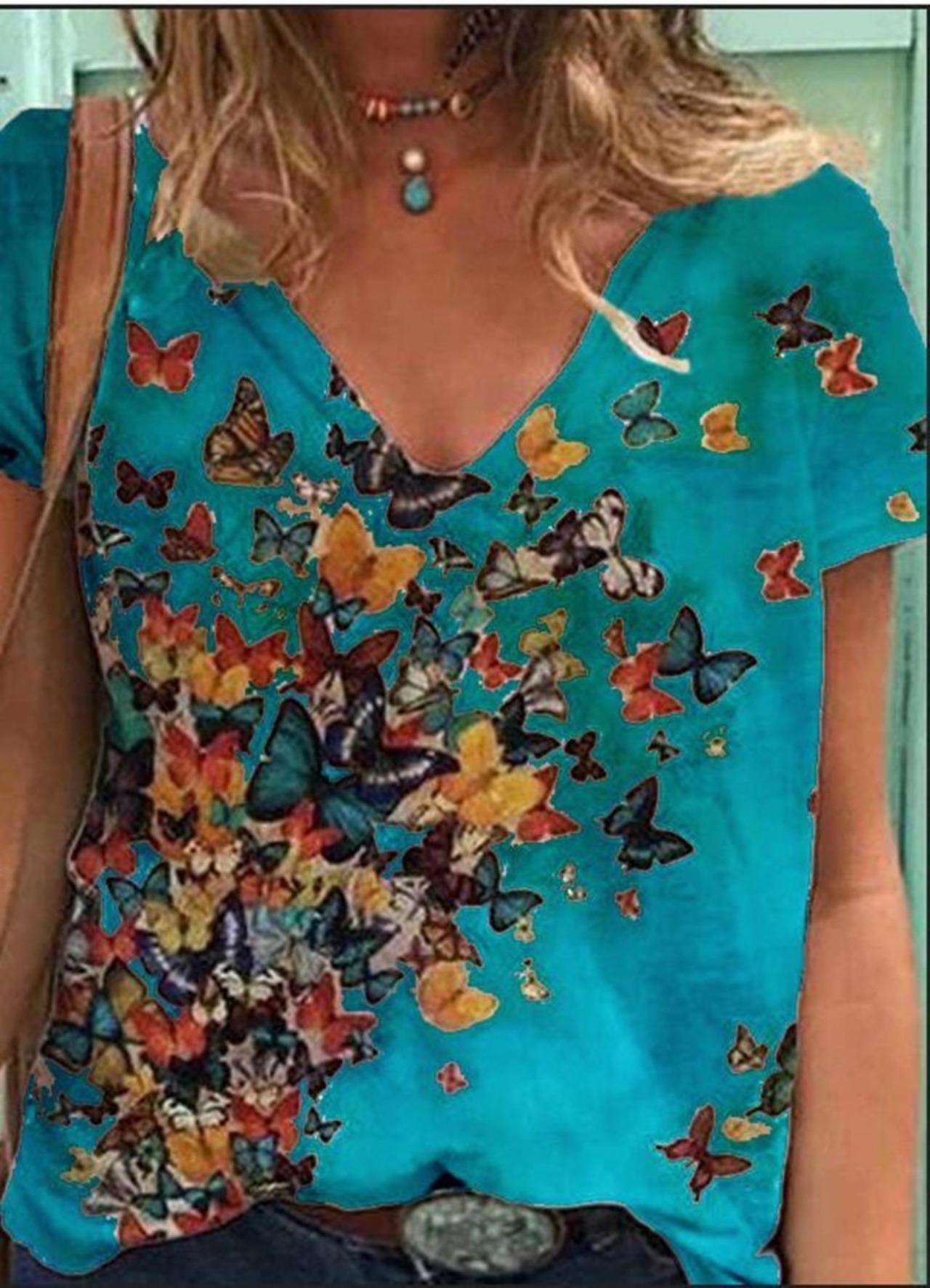 ヨーロッパとアメリカンスタイルのeigntrade AmazonAliExpressの新しいeigntrade女性用Vネックトップレトロバタフライプリント半袖Tシャツ ヨーロピアン 6733082404426515