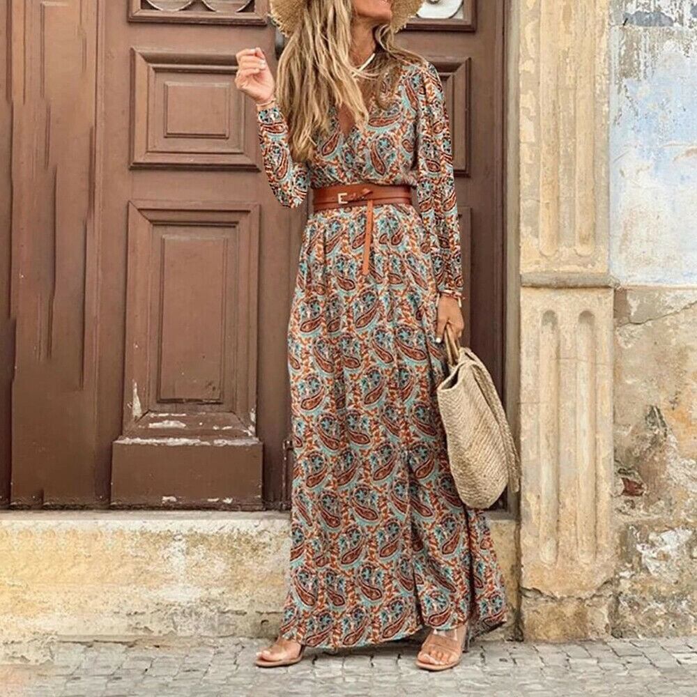 ウィッシュヨーロピアンとアメリカンスタイルの新しいファッション爆発スタイル秋と冬の長袖Vネックボヘミアンフローラルドレスレディース ロング オータム 秋物 ウィンター 冬物 花柄 6733046543665317