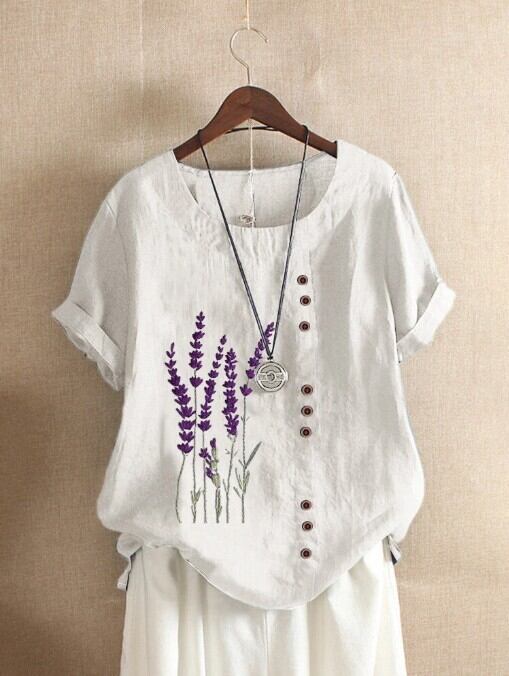 ヨーロッパの駅の文学と芸術ファンレトロラベンダープリントボタンコットンリネンルーズ半袖シャツ女性のトレンド ショート ハーフスリーブ ヨーロピアン 6733075022345991