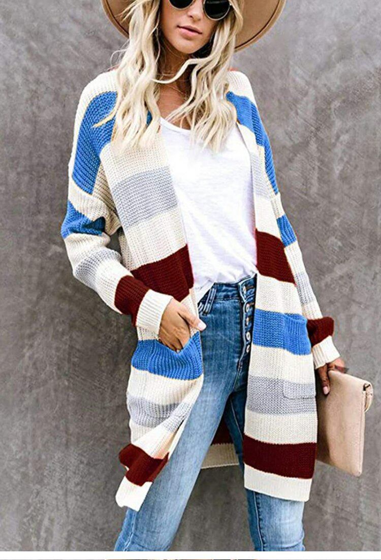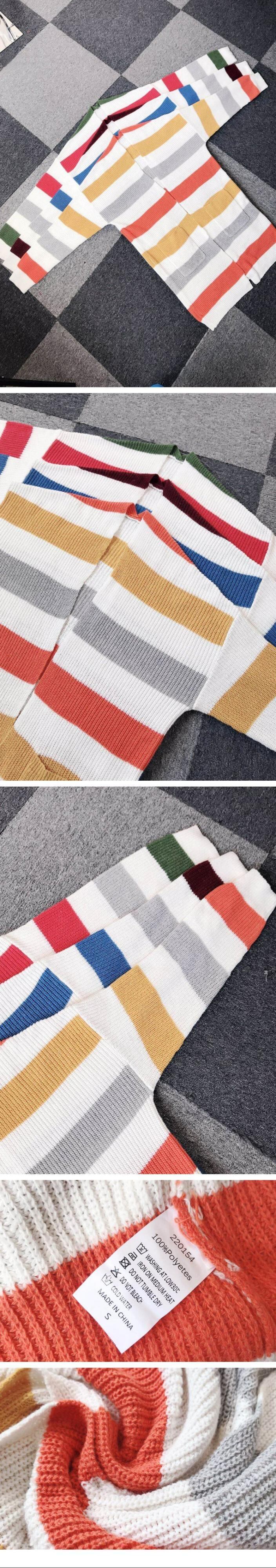 ヨーロッパとアメリカンスタイルの秋と冬の新しいストライプステッチセーター新しいロングカラーマッチングポケットニットカーディガン女性のトレンド オータム 秋物 ウィンター 冬物 ヨーロピアン 6733012348514750