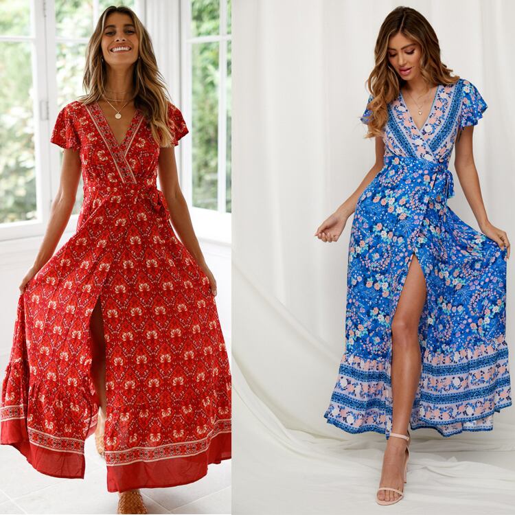 夏の新作ファッション販売タイバケーションVネックカーディガンレースアップドレスプリントビーチロングスカート女性の潮 サマー 夏物 6733062791127214
