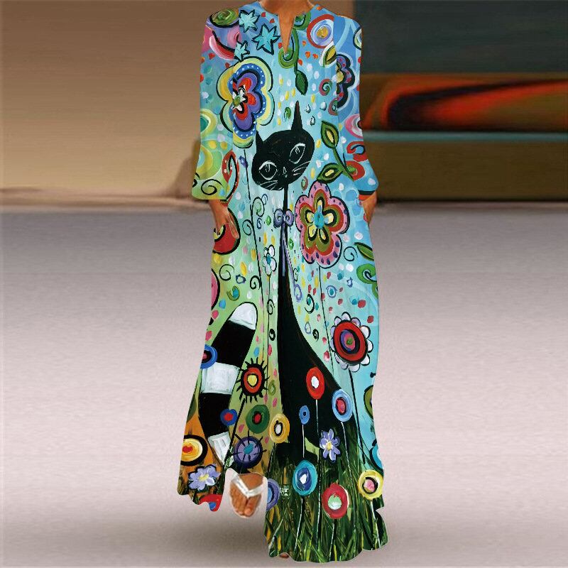 夏のヨーロッパとアメリカの新しいAliExpressはセクシーなVネック長袖プリントロングスカートルーズロングスイングドレスを望みます サマー 夏物 6733090601798251