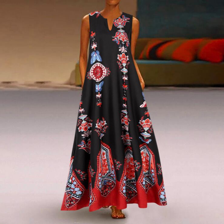 レディースレトロプリントVネックノースリーブインサートポケット春夏ビッグスイングAラインドレスを販売するヨーロッパとアメリカンスタイルのストリートファッション スプリング 春物 サマー 夏物 ヨーロピアン 6733080569038563