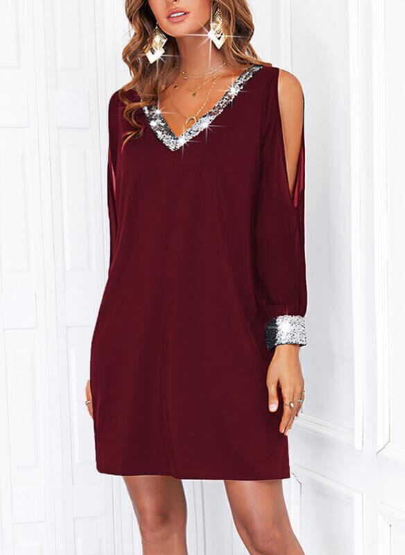 春と夏の新しいファッション気質ヨーロッパとアメリカの新しいVネックロングスパンコールステッチルーズな長袖ドレス女性の潮 スプリング 春物 サマー 夏物 ヨーロピアン 6733078886247771