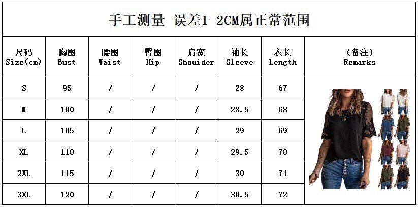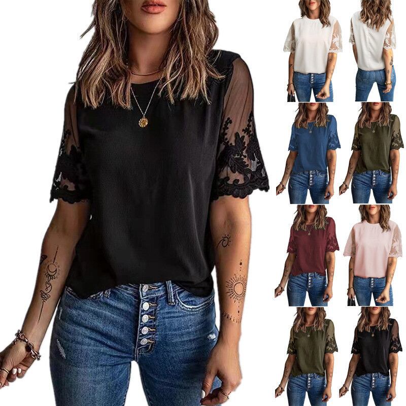 夏の新しい独立局アマゾンヨーロッパとアメリカのストリートファッションの女性の無地のラウンドネック半袖トップレースシフォンシャツ サマー 夏物 Oネック ソリッドカラー 6733054504171919